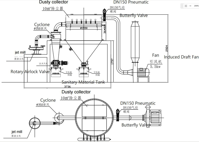 1. Material conveying pipelines use 316L stainless steel, clamp quick-connect or flange connection (from main unit to cyclone, to dust collector). |