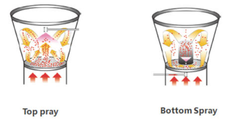 1.2 Bottom Spray: Combines fluidization and airflow transportation. Forms a central rising zone and a peripheral fluidization zone. The material in the central zone is pushed upward by the airflow, moves to the expansion chamber to form the rising zone, and falls into the peripheral zone when gravity overcomes the gradually weakening thrust, forming a reciprocating flow state from the center to the periphery, changing random fluidization into regular flow. Its characteristics are: co-directional spray, nozzle buried in the material, short droplet travel; high probability of granules passing through the spray mist; high density of granules in the spray area.