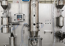 Air is filtered and heated, then enters the granulation chamber through the airflow distribution plate, causing the powder to suspend and form a fluidized state due to the combined action of airflow and gravity. Compressed air and binder enter the nozzle through their respective pipelines, and the binder is atomized into fine droplets at the nozzle, sprayed onto the fluidized powder to form granules. During this process, the left and right exhaust valves and cylinders periodically alternate to clean the powder adsorbed on the collection bag, allowing it to fall back into the granulation chamber, thus completing mixing, granulation, coating, and drying operations.
